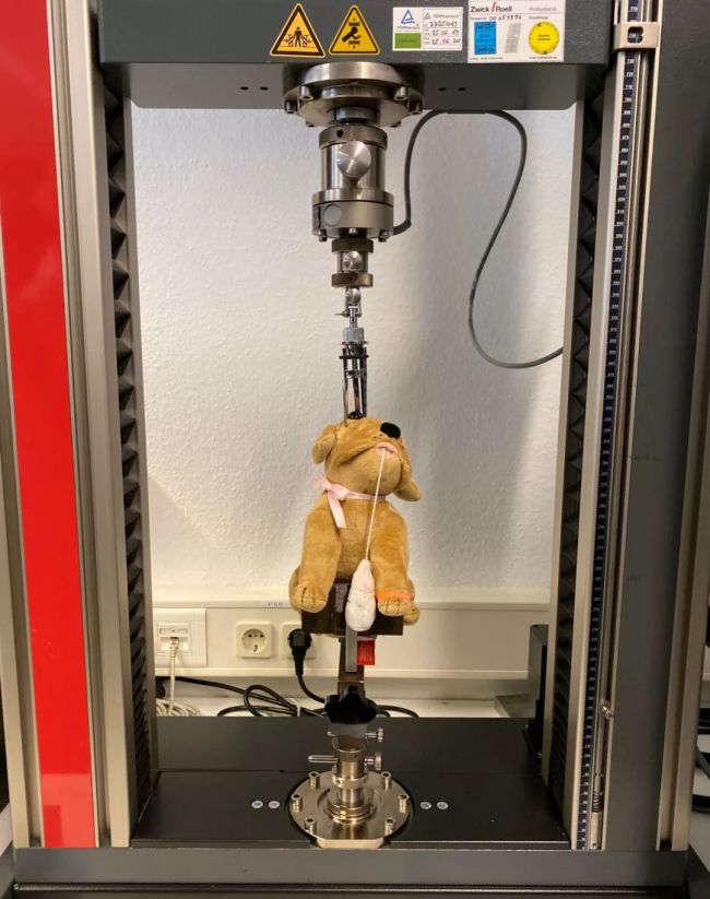在玩具实验室里,TUV莱茵的工作人员向我们展示了关于玩具安全性的测试方式,其中以 90 牛顿的力拉扯公仔的眼睛部件,坚持 10 秒不脱落才可通过。由于玩具的特殊性,对于婴儿有着各种不确定性的危险,因此国际安全标准对不同年龄段的玩具及其外包装都有严格规范和要求,TUV莱茵会根据标准对产品进行测试。