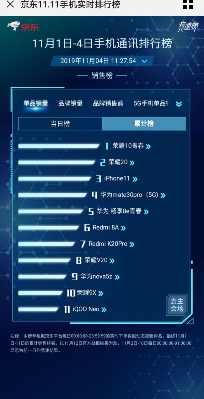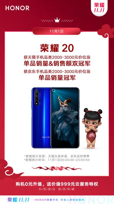 从双十一首战双冠等战绩方面来看,也证实荣耀20系列的真香特质。双十一开战当天,荣耀20就获得了天猫手机品类2000-3000元价位段销量&销售额双冠军,以及京东手机品类2000-3000元价位段单品销量冠军。与此同时,11.1-11.4,荣耀20也取得了京东手机品类单品销量累计排行榜的第二位,力压iPhone11,看来荣耀20系列手机才是今年的真香机。
