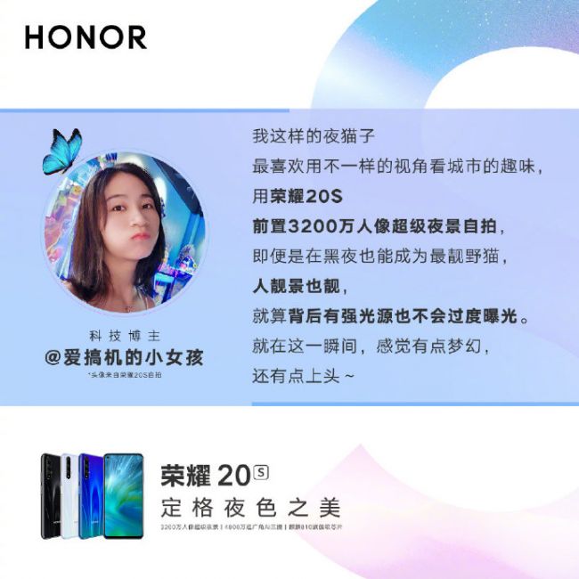 而有着“荣耀年度最强自拍手机”之称的荣耀20S则搭载了3200万人像超级夜景技术,突破性地将AIS人像超级夜景技术应用于前置,带来了“人像超级夜景自拍模式”,让夜景自拍实现 “夜美人更美,景亮人更靓”的效果。