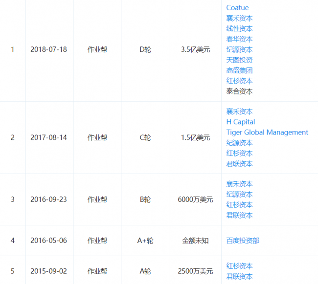 作业帮最近的一轮融资为2018年7月完成的3.5亿美元D轮融资,该轮融资由 Coatue 领投,高盛、春华资本、红杉中国、GGV纪源资本、襄禾资本、天图投资、NEA、泰合资本等新老股东跟投。