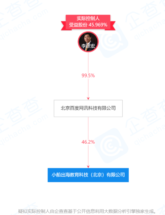 企查查数据显示,公司最大股东为百度的运营主体北京百度网讯科技有限公司,持股比例为46.20%。公司实际控制人为李彦宏,持股比例为45.97%。