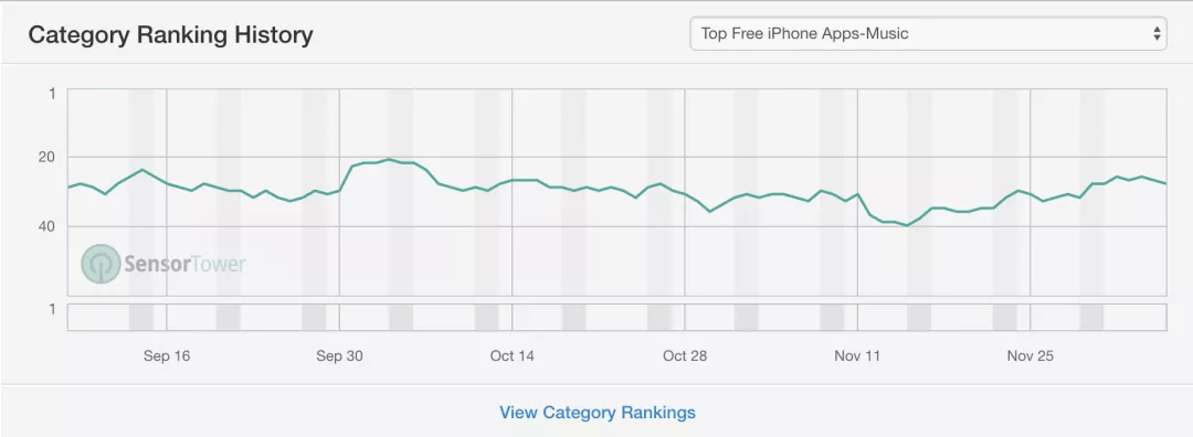2018年末和2019年初,音遇凭借“音乐+游戏+社交”异军突起,在巨头林立的音乐社交分得一杯羹,但现实是经过2019年2月和4月的两次全网下架,如今音遇的下载量已在AppStore社交榜单的200名之外。SensorTower的数据也显示,今年9月到12月之间,音遇的排名也几乎保持不变。