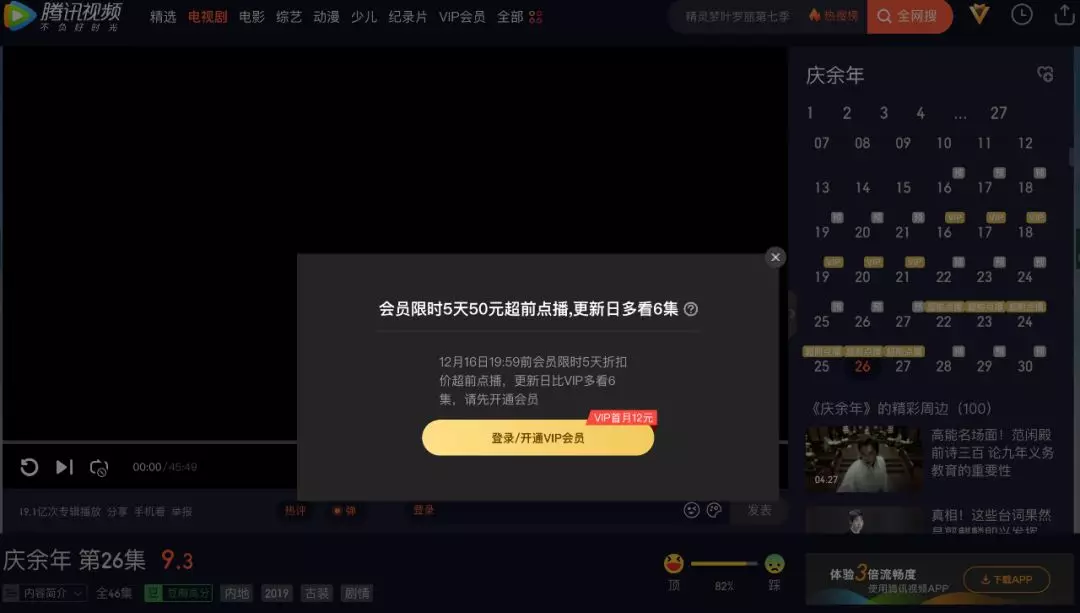 12月11日,腾讯视频开启《庆余年》超前点播,在会员的基础上再付费50元,即可提前解锁6集内容。或者选择单集解锁,每集3元。