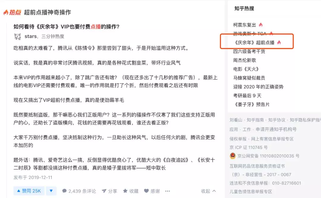 网友stars呼吁,大家千万别付费点播,坚决抵制这种行为,一旦助长这种风气,以后任何火的剧,腾讯会更变本加厉的。截止目前,这条回答在知乎收获了25000个赞同和2439个评论。