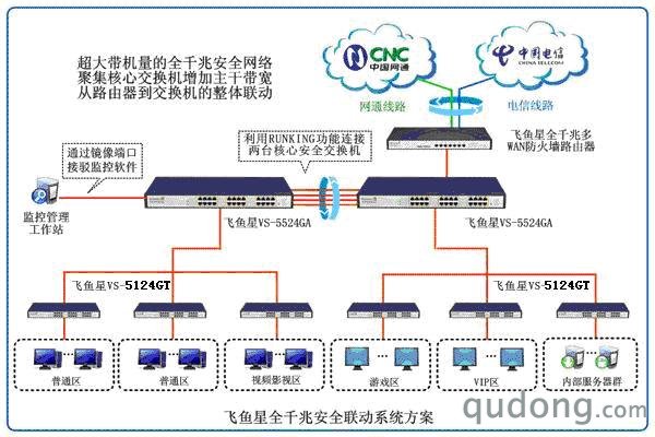 全网的QoS机制,保证重要应用的优先级,例如游戏传输优先、无盘启动优先、提高网克速度。启用VLAN功能优化网络广播域,端口镜像满足公安文化的监控要求。核心交换机能够保护路由器,过滤不必要的包转发,让路由器的性能得到最好的发挥。接入采用VS-5124GT安全联动型千兆交换机,从路由器到交换机的整体联动,彻底确保内网安全。VS-5124GT支持丰富的二到四层的流分类、完善的服务质量(QoS)、组播管理特性,可以实施灵活多样的安全和管理策略,包括支持基于物理端口、802.1P、COS协议的优先级控制(二层);支持基于IP和协议的带宽速率限制或优先级控制(三层);支持基于传输流和协议的带宽速率限制或优先级控制(四层)。