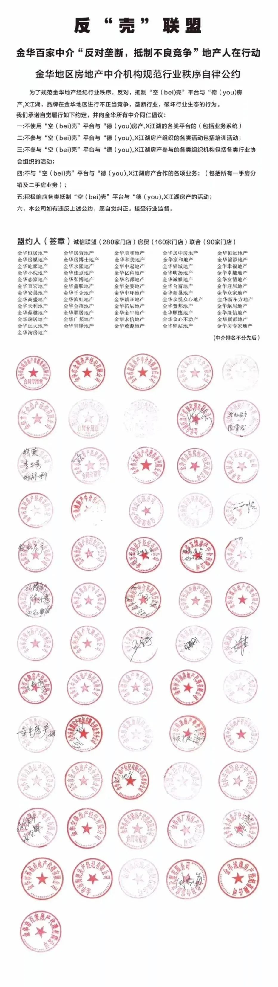 以金华为例,涵盖了当地种类齐全的上百家中小微经纪公司,共同签署了《反壳联盟条约》,理由是贝壳系公司“不正当竞争、垄断行业,破坏行业生态”。当一个城市的同行都反对时,也是贝壳应该反思的时候。