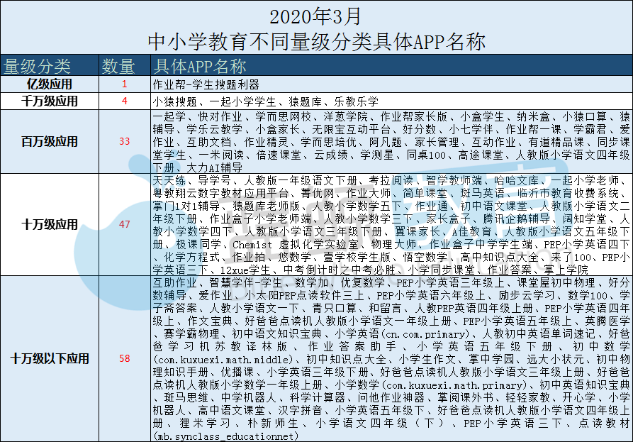 整体而言,3月份应用规模级别与渗透率,同2月份相比变动不大,巨头发力之后,热度还在扩散,“作业帮”破亿后月活再创新高,领域渗透率过半后再上一层楼,进一步加剧了行业的马太效应,下面是不同量级分类具体的APP名称,供业内人士查阅: