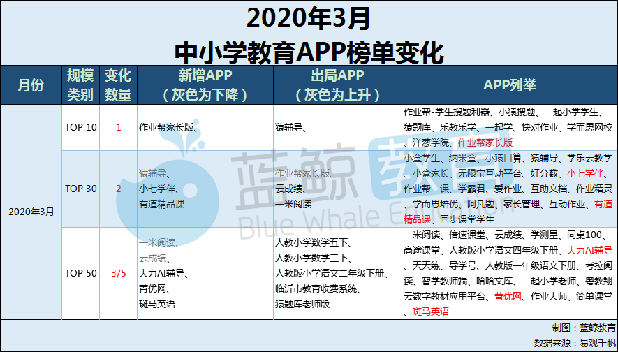 蓝鲸教育智库梳理了2020年3月末,中小学教育APP的具体榜单变化,下图是“2020年3月中小学教育APP榜单变化”,标灰色的APP表示从上一级别甩出到下一级别或者从下一级别进入上一级别,并不算作该级别新增APP。