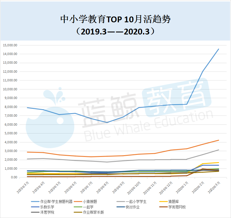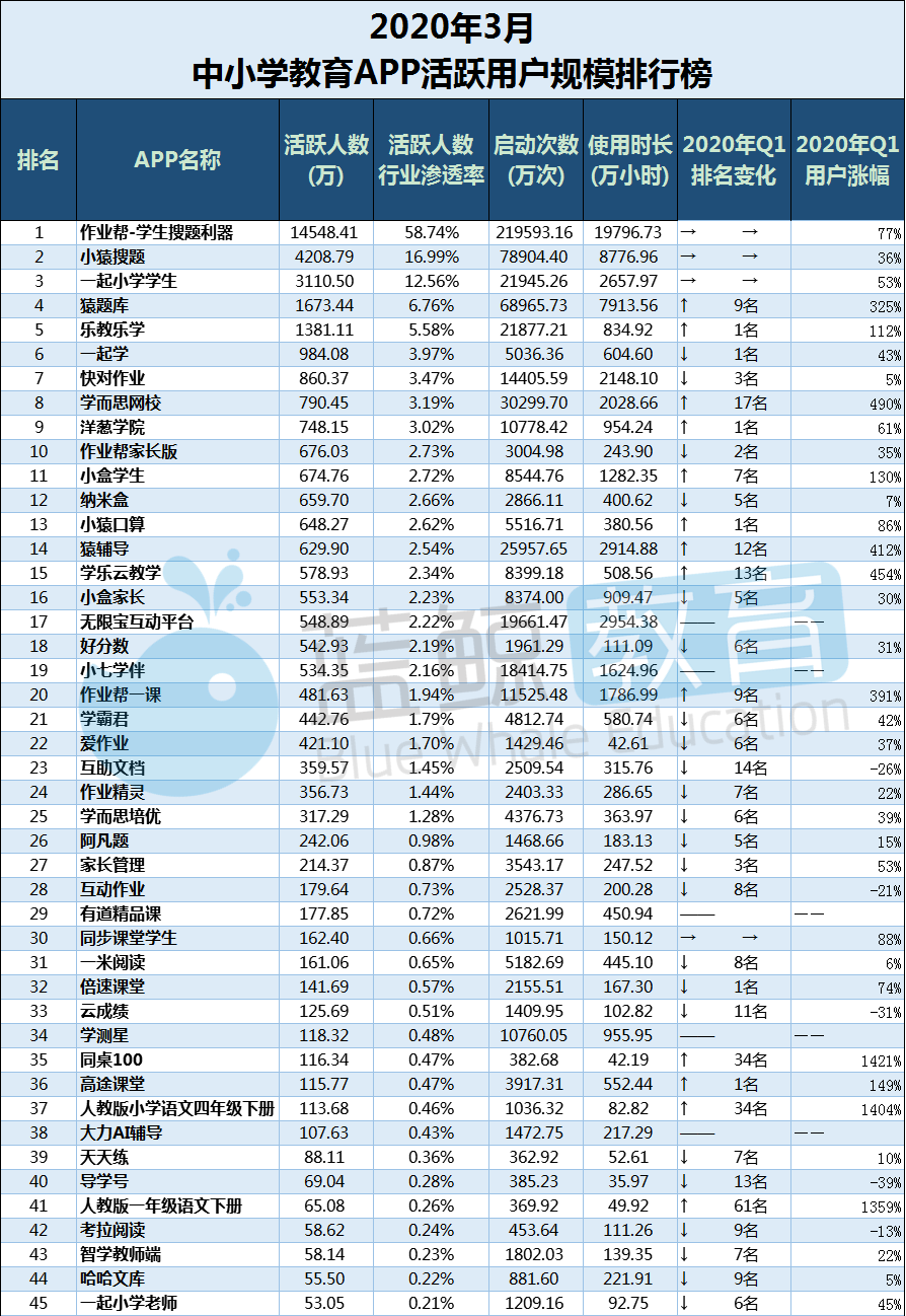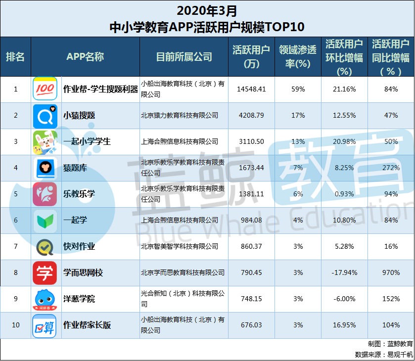 我们知道3月榜首“作业帮”于2020年2月末用户突破亿级规模,3月末环比增幅21.16%,再创新高,月活达14,548.41万,约1.45亿,领域渗透率也从2月末的53%上升至59%,进一步扩大影响力,可谓强者愈强,马太效应进一步加剧。