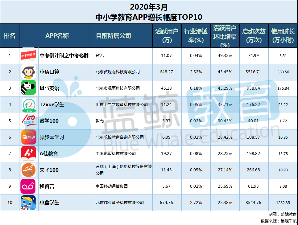 2020年3月末用户增速前十的APP分别是:“中考倒计时之中考必胜”、“小猿口算”、“斑马英语”、“12xue学生”、“数学100”、“励步云学习”、“A佳教育”、“来了100”、“和留言”、“小盒学生”。
