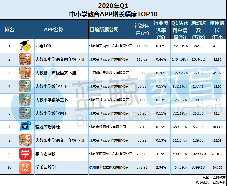 下面是2020年第一季度中小学教育APP用户增长幅度TOP 10榜单:
