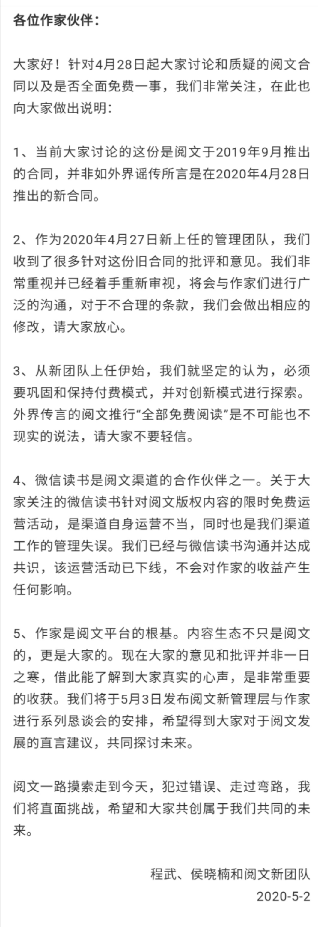 5月3日,阅文新任管理层就近期网传阅文向网文作者施加“霸王合同”、侵害作者权益发布《关于近期不实传言的说明》。阅文称,目前已针对该合同进行审视及相应修改,同时,该说明也强调阅文不会放弃付费模式,“推行全部免费阅读是不可能也不现实的说法”。