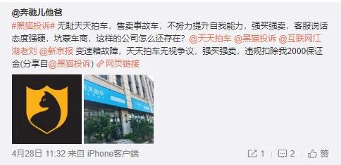 近年,在黑猫投诉APP上天天拍车也常被用户投诉到强制扣留保证金。