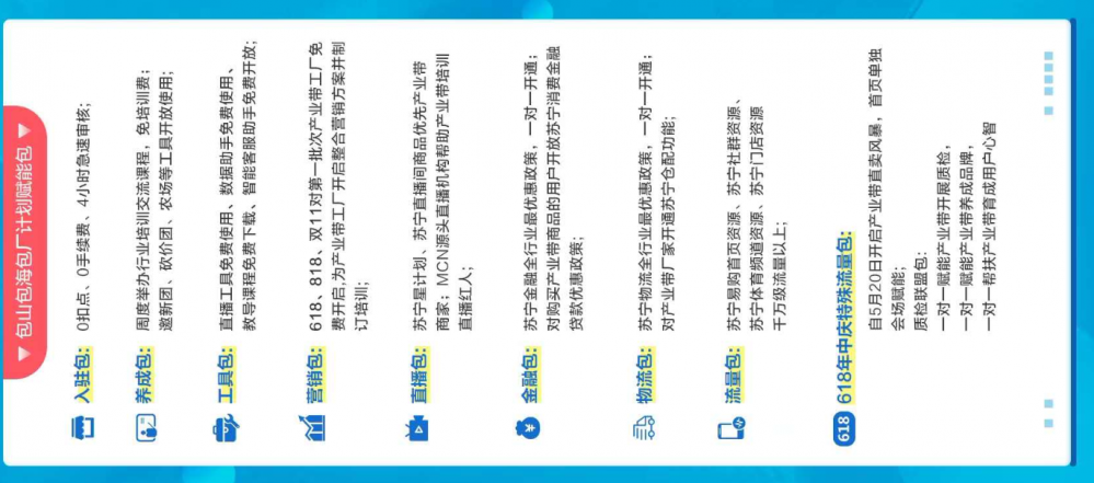 为了扶助产业带商户快速成长,苏宁拼购发布了“包山包海包厂”赋能包,从物流、金融、营销、直播、工具等多个角度扶助产业带商户。