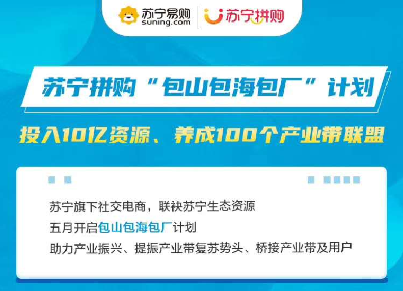 从五月起,苏宁拼购将投入10亿资源,培养100个产业带,通过包销的方式,与产业带商户结成“战略同盟”。首批将针对广州、义乌、舟山等多个产业带的商户,苏宁包销1000万双凉拖、1000万件T恤、500吨带鱼、3亿包抽纸、500吨小龙虾等商品。