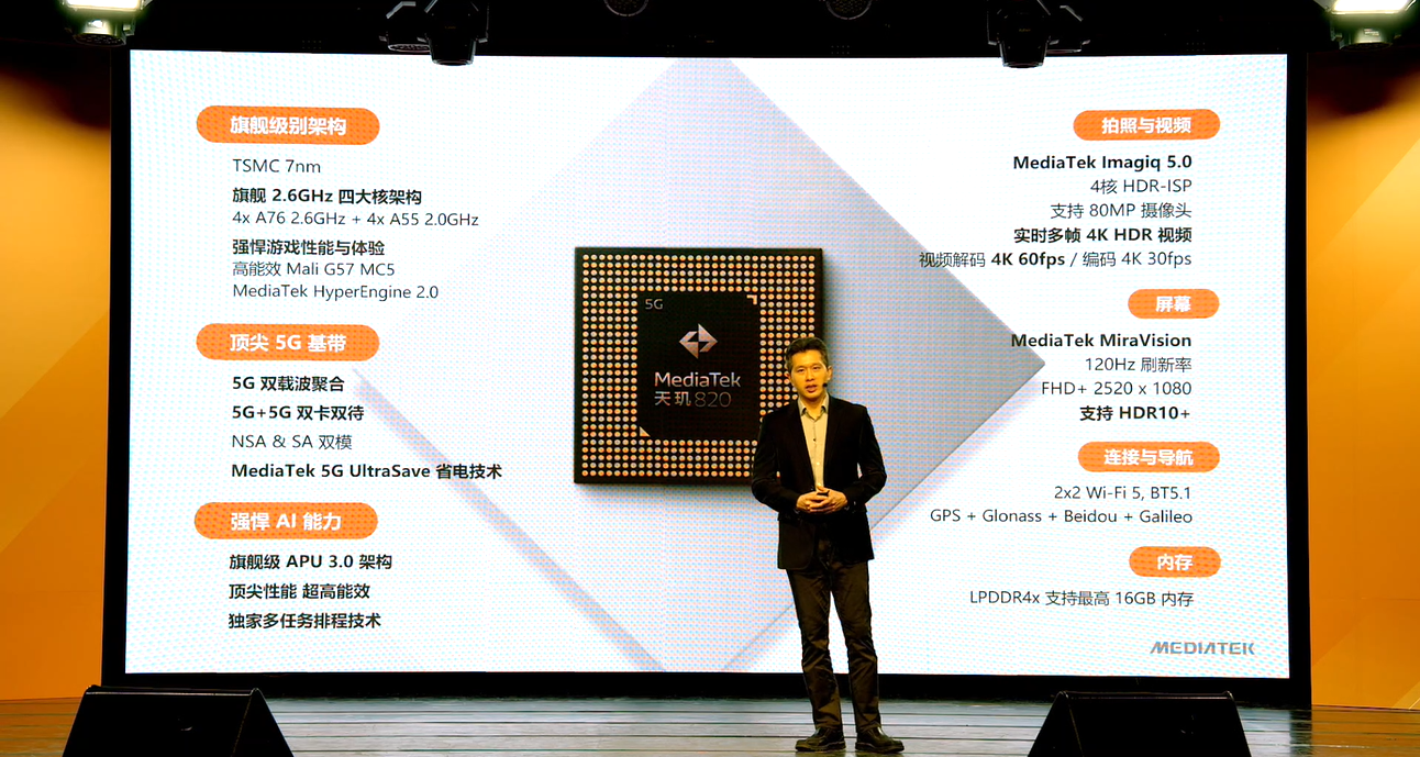据了解,MediaTek天玑820采用7nm工艺制造,集成全球顶尖的5G调制解调器,5G省电解决方案带来超低5G功耗,采用旗舰级多核CPU架构,同时搭载独立AI处理器APU3.0。