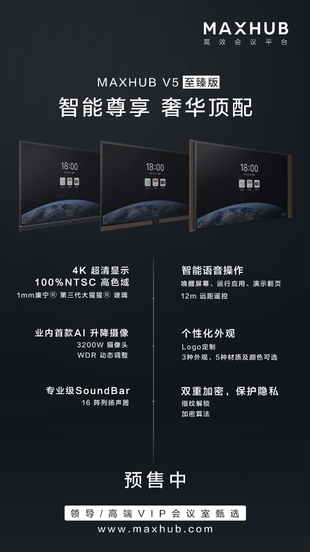 MAXHUB V5科技版专门为高端会议打造。除了将发声处打造为超窄缝隙,营造细腻清晰音效的同时兼顾外形的艺术性与极致美感,从视觉感官上提升会议品质。为了避免误操作或恶意软件攻击带来的会议信息泄漏,MAXHUB 推出了全球业内首款翻转摄像头,不使用时隐藏摄像头。其次,V5科技版采用了商用国密加密算法,为无线传屏及云端信息共享提供了更专业的保护。基于此,MAXHUB也成为首个获得赛宝实验室会议平板类产品信息安全认证的产品。