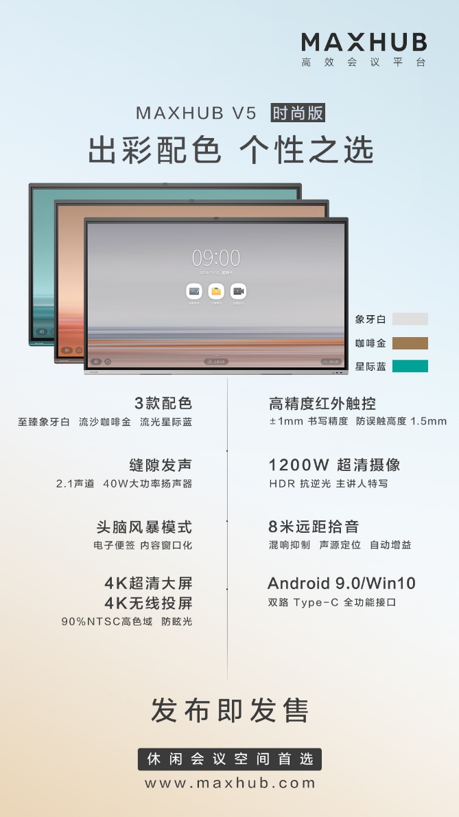 为了满足这些灵感需求,V5时尚版和旋转版专为开放空间办公所打造,超薄机身可以便捷移动,让智慧碰撞的会议空间无处不在。此外,为适配办公空间的不同风格,时尚版还设计了象牙白、星际蓝、咖啡金三种新潮配色。为了追求极简、时尚外观,时尚版创新推出了缝隙发声概念,在保证优质音质的前提下,成就了超窄边框的简约美。