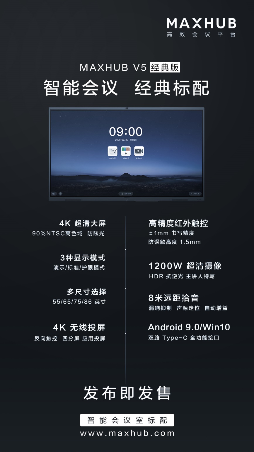 MAXHUB V5经典版,配置有4K超高清和4K高清UI显示,1200W像素摄像头让远程会议现场真实呈现,90%NTSC的高色域,画面品质卓越。兼容安卓9.0、Windows10和UOS三种系统以及type-c接口等配置,都让经典款成为传统会议室标准配置。值得一提的是,为了满足用户“在灵感到来的时候,立刻把自己的想法写下来”的办公需求,MAXHUB推出了“提笔即写”的功能。只需拿起笔,无需手动调取白板,便可以直接快速地进入书写状态,捕捉转瞬即逝的灵感。