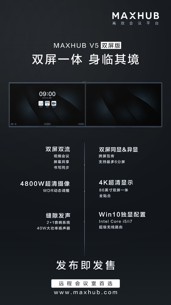 MAXHUB基于这样的需求,深入攻克难题,突破了原有的单一平板形态,将双屏之间的黑边压窄到极致,采用双屏一体的设计,一屏显示超清视频会议,一屏显示演示文档,同时支持异地书写互动,确保信息实时同步,让异地团队像共处一室般,让自然畅谈、头脑激荡、讨论决策更为高效。在大型视频会议的场景中,MAXHUB做到了足够的专注与极致,才能打造出双屏高清巨幕书写、演示两不误的新形态产品。
