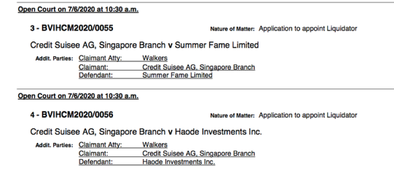 据财联社旗下财经帐号《科创板日报》的报道:根据英属维京群岛法院的文件,由瑞信牵头的包括高盛在内多间银行在英属维京群岛法院起诉Summer Fame Limited(由瑞幸咖啡前CEO钱治亚控制,钱治亚持有瑞幸咖啡15.43%的股份)及Haode Investments Inc(由董事长陆正耀控制,持有瑞幸咖啡23.94%的股份),并将于7月6日宣判。