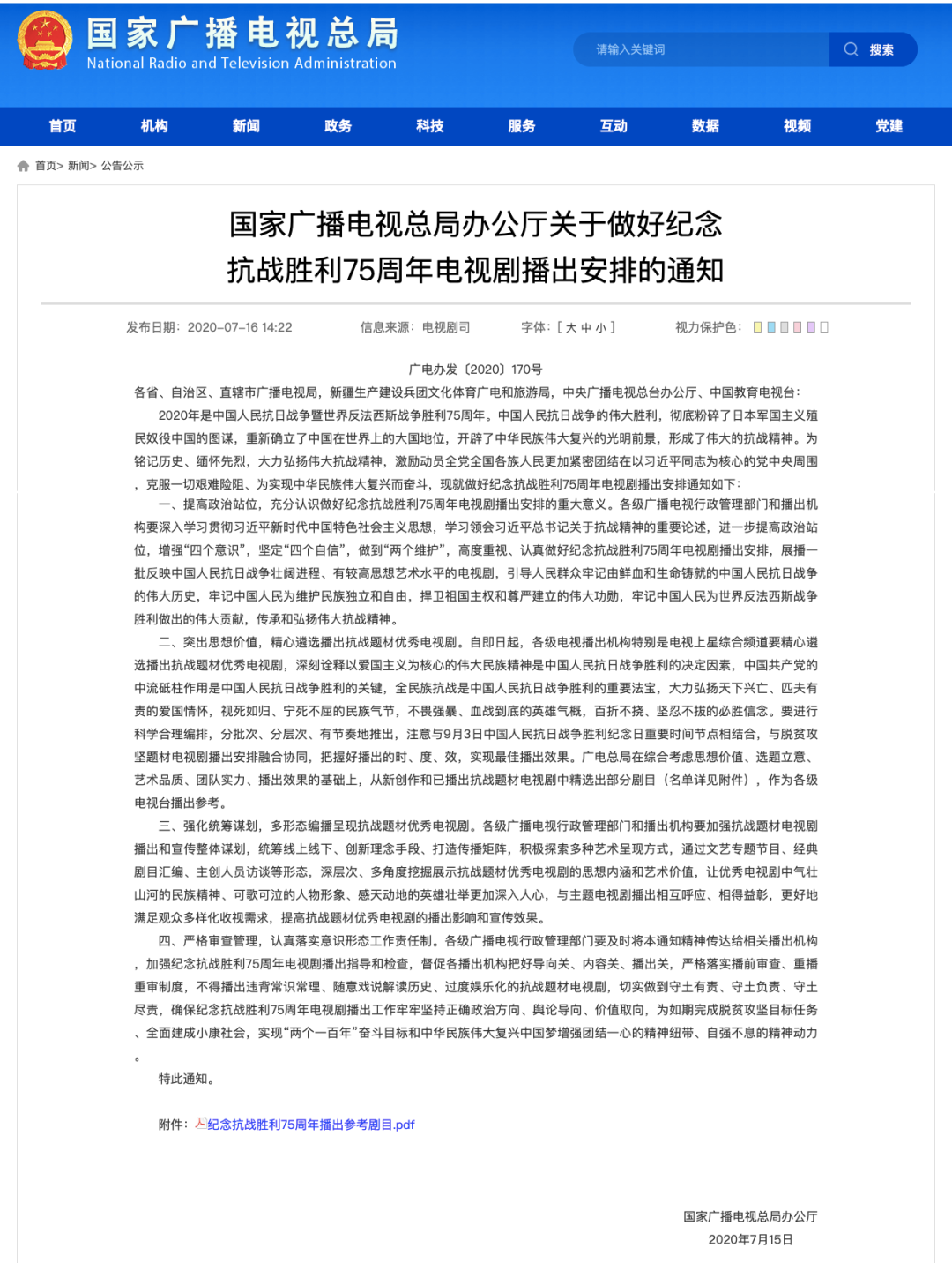 此外,针对纪念抗战胜利75周年电视剧的播出安排,7月16日,广电总局下发通知。通知要求相关播出机构不得播出违背常识常理、随意戏说解读历史、过度娱乐化的抗战题材电视剧,并附《纪念抗战胜利75周年播出参考剧目》,《亮剑》、《战长沙》等24部影视剧在内。