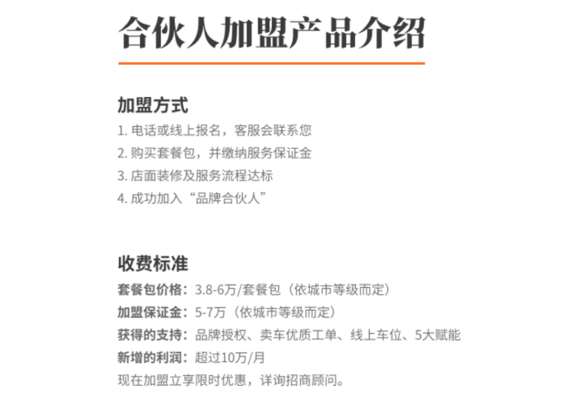 在人人车官网可以看到,想要加入人人车成为合伙人,需要缴纳5-7万元的加盟保证金,购买3.8-6万元的套餐包(保证金和套餐包的价格均依城市等级而定)。人人车则将为合伙人提供“品牌授权、卖车优质工单、线上车位、5大赋能”的支持。人人车称,合伙人每月将会获得超过10万元的新增利润。