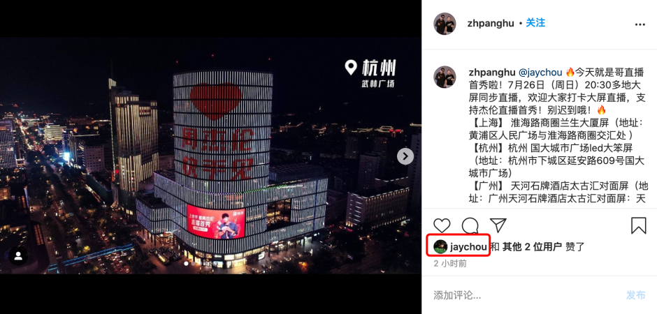 更惊喜的是,这次直播还将在上海淮海路商圈兰生大厦屏、杭州国大城市广场led大笨屏、广州天河石碑酒店太古汇对面屏、成都天府广场百扬大厦屏、重庆解放碑重庆百货屏上实时直播。今晚8点半后,这五座城市的热门商圈显示屏上,将同步开启直播,线上线下联动,真正做到了“把周杰伦直播打在公屏上”。