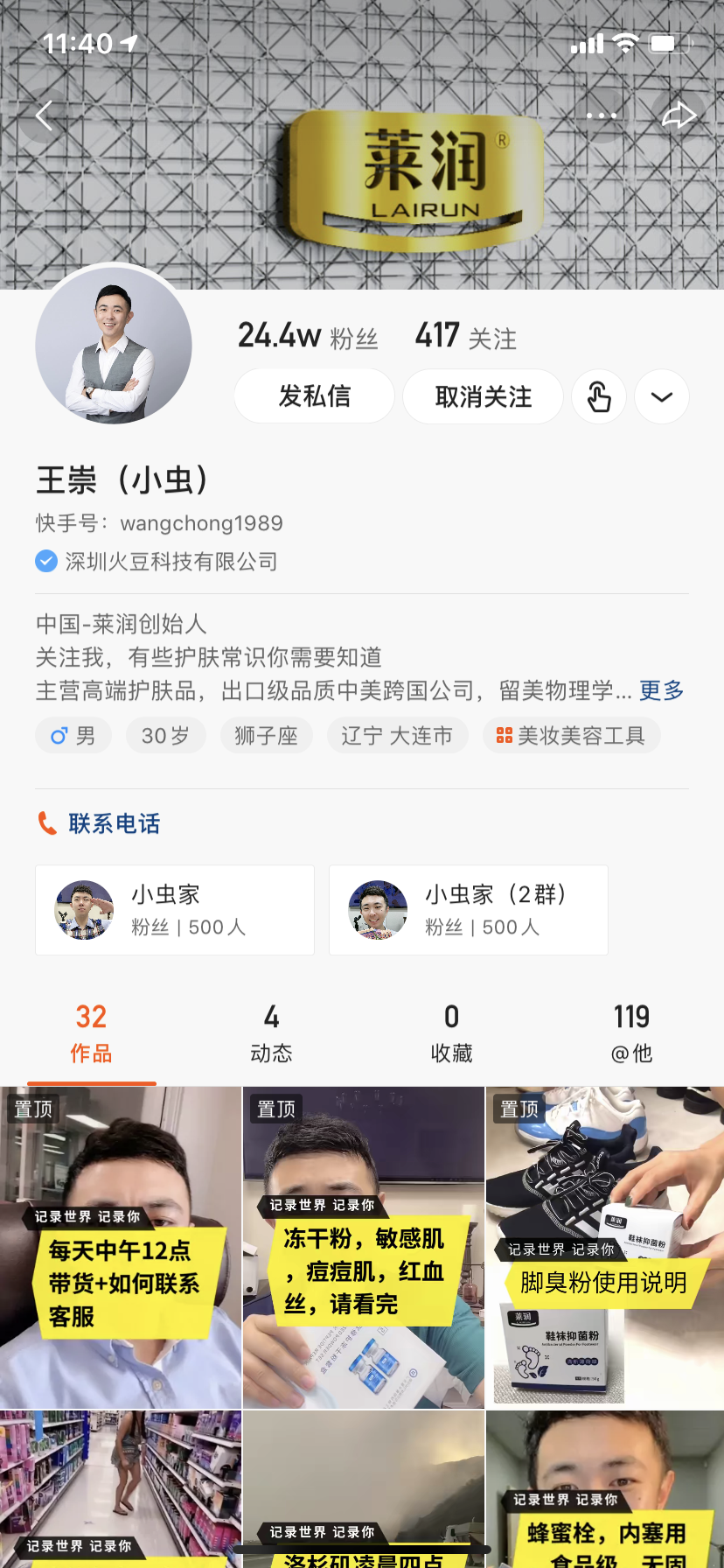 为此,王崇创建了自己的护肤品牌莱润,同时严选好物推荐给老铁们。自2019年底入驻快手以来,目前王崇在快手有24W粉丝,粉丝粘性和复购率都很高。在王崇看来,他在快手的最大竞争力是:借助快手“老铁文化”氛围,以专业性深耕粉丝经济,进而实现商业模式新突破。