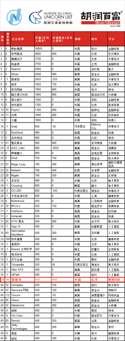蓝鲸教育8月6日讯,日前,胡润研究院发布《2020胡润全球独角兽榜》,猿辅导在线教育再次上榜,以500亿元估值位列全球第35名,较2019年度提升49名,于中国在线教育行业中位居首位。