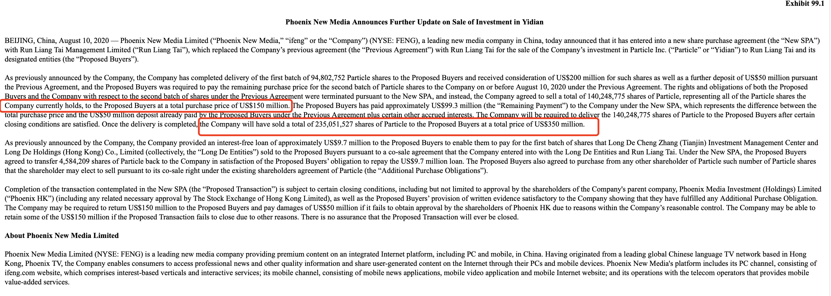 8月10日晚间,凤凰新媒体对外发布公告称,已同润良泰签署了一份新的股份购买协议,按照新的协议,凤凰新媒体手上剩余的约1.4亿股将以1.5亿美元的价格全部出售给润良泰。凤凰新媒体已于8月10日收到润良泰依据新协议支付的全部价款。