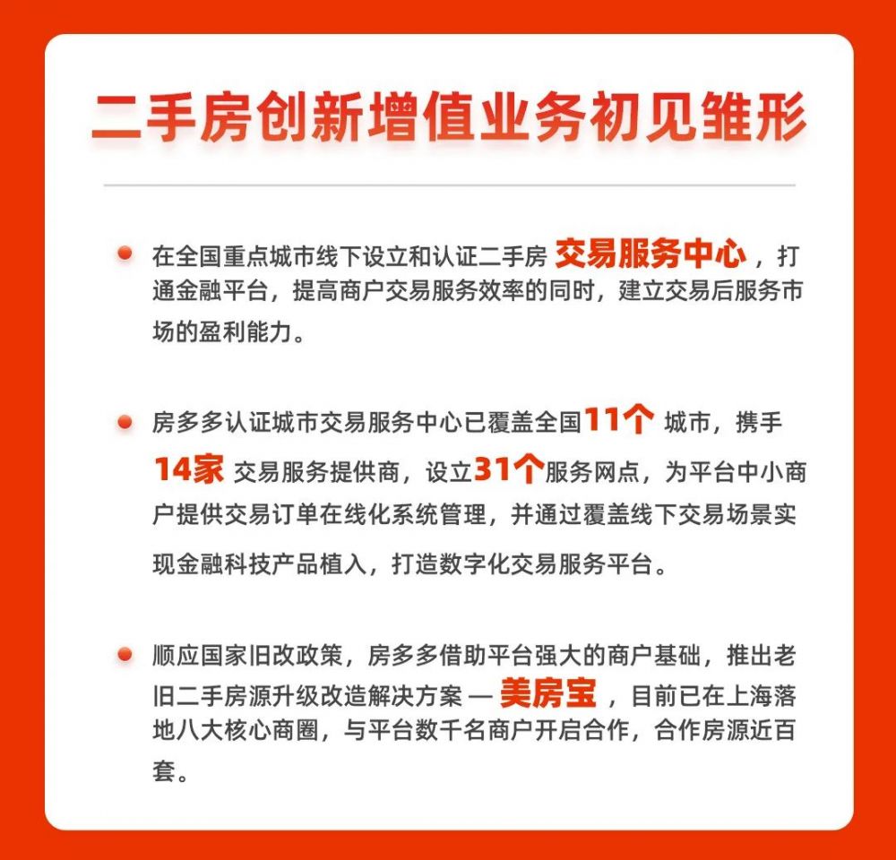 此外,房多多开辟的存量新生意还包括:通过在全国重点城市线下设立和认证交易服务中心的方式打通金融平台,提高商户交易服务效率的同时,建立交易后服务市场的盈利能力;响应国家旧改号召,通过升级改造城市老旧二手房提高交易效率,与平台商户共享利润。目前房多多认证城市交易服务中心已覆盖全国11个城市,14家交易服务提供商,设立31个服务网点。“美房宝”产品已在上海八大核心商圈落地,数千名商户参与合作,合作房源已近百套。