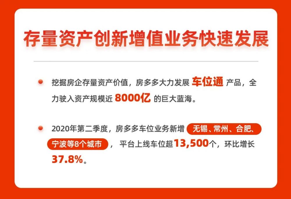 针对开发商大量的低流速车位资产,房多多在2019年12月推出的创新产品“车位通”呈现快速发展态势,全力驶向资产规模近8000亿的巨大蓝海。2020年第二季度,房多多车位业务全面进入无锡、常州、合肥、宁波等8个城市,上线车位超过13500个,环比增长37.8%,实现服务渠道收入5,462万,环比增长53%。