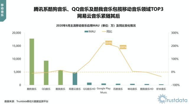 Trustdata监测数据也显示,今年6月主流移动音乐应用MAU数据中,网易云音乐位列第四,同比处于下滑状态,而酷狗、QQ音乐和酷我的腾讯系则是上升。