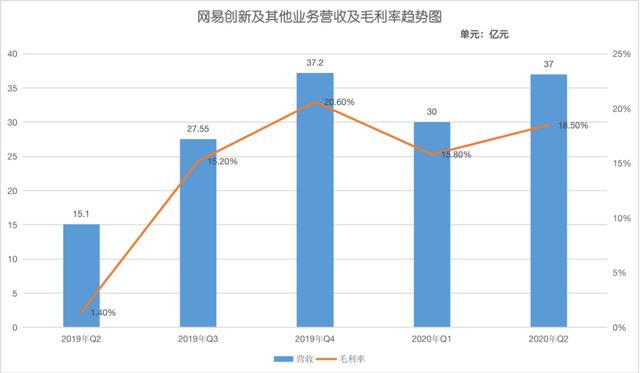 Q2财报中,网易着重提及了创新及其他业务的整体毛利率提升至18.5%。相比之下,较上季度创新及其他业务的毛利率的确有环比近3%的提升,但较2019年Q4的20.6%仍旧是负增长。