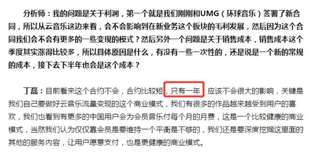 不过有意思的是,两天后也就是8月13日在网易Q2的财报电话会议上,网易CEO丁磊又曝出了一个真相,那就是网易云音乐通稿中的「数年」合作期限,其实只有1年。而隔壁的腾讯音乐新合约的期限为3年。