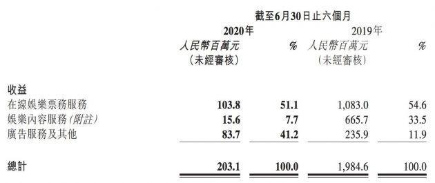 娱乐内容服务方面,猫眼娱乐的所得收益由2019年上半年的6.657亿元下降至2020年上半年的0.156亿元。此外,猫眼娱乐的广告服务及其他所得收益也由2019年上半年的2.359亿元减少64.5%至2020年上半年的0.837亿元。