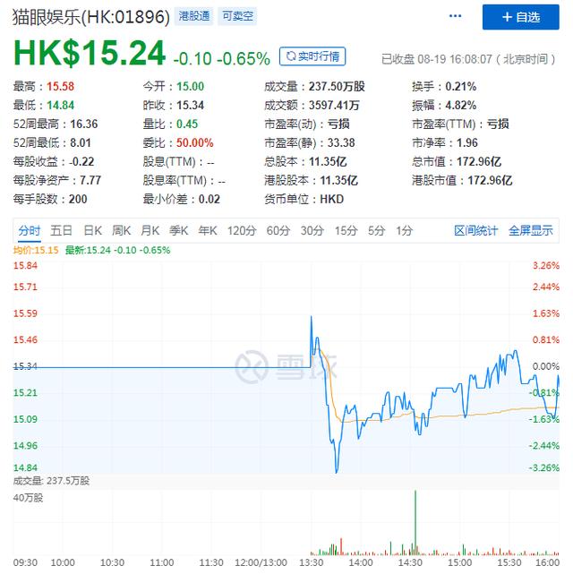 财报披露当日收盘,猫眼娱乐股价涨5.09%,报收14.86港元。至周二收盘猫眼娱乐股价再次小涨3.23%。截止发稿,其股价累涨7.67%,报15.24港元,总市值为172.96亿港元。由此可见,资本市场对于猫眼娱乐的后市还是抱持看好态度。