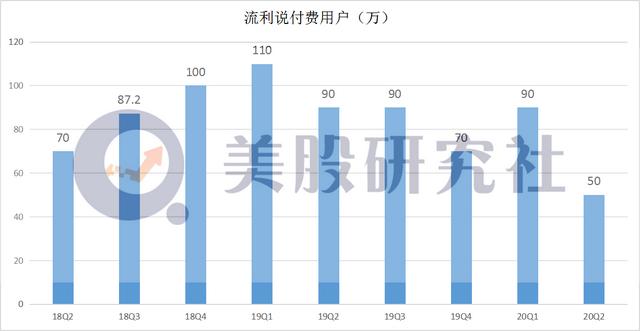 从2019Q1至2020Q2,流利说付费用户数量分别为110万、90万、90万、70万、90万和50万。不难看出,流利说付费用户规模增长陷入瓶颈,90万左右或是常态,突破百万大关已是非常困难,尤其现在付费用户规模还缩水。