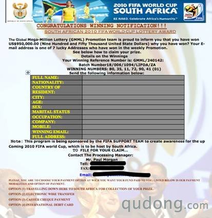 近日迈克菲实验室发现有犯罪分子以每周开奖一次的世界杯彩票为噱头,向用户发送中奖通知邮件,诱使用户相信其赢得了将近100万美元的奖金。与常见钓鱼骗局不同的是,此类骗局并未直接要求用户输入信用卡账号等财务信息,而是要求输入姓名、电话号码、电子邮件等私人信息,以便达到麻痹用户的目的。如果用户填写了电话号码并回复了邮件,那么其手机邮箱就开始接收大量的垃圾邮件。即使什么都不做、仅仅出于好奇心浏览这类网页也是很危险的。这些钓鱼网站通常会利用最新的零日漏洞对用户发动袭击。这种情况下,最安全的操作就是立即删除邮件。