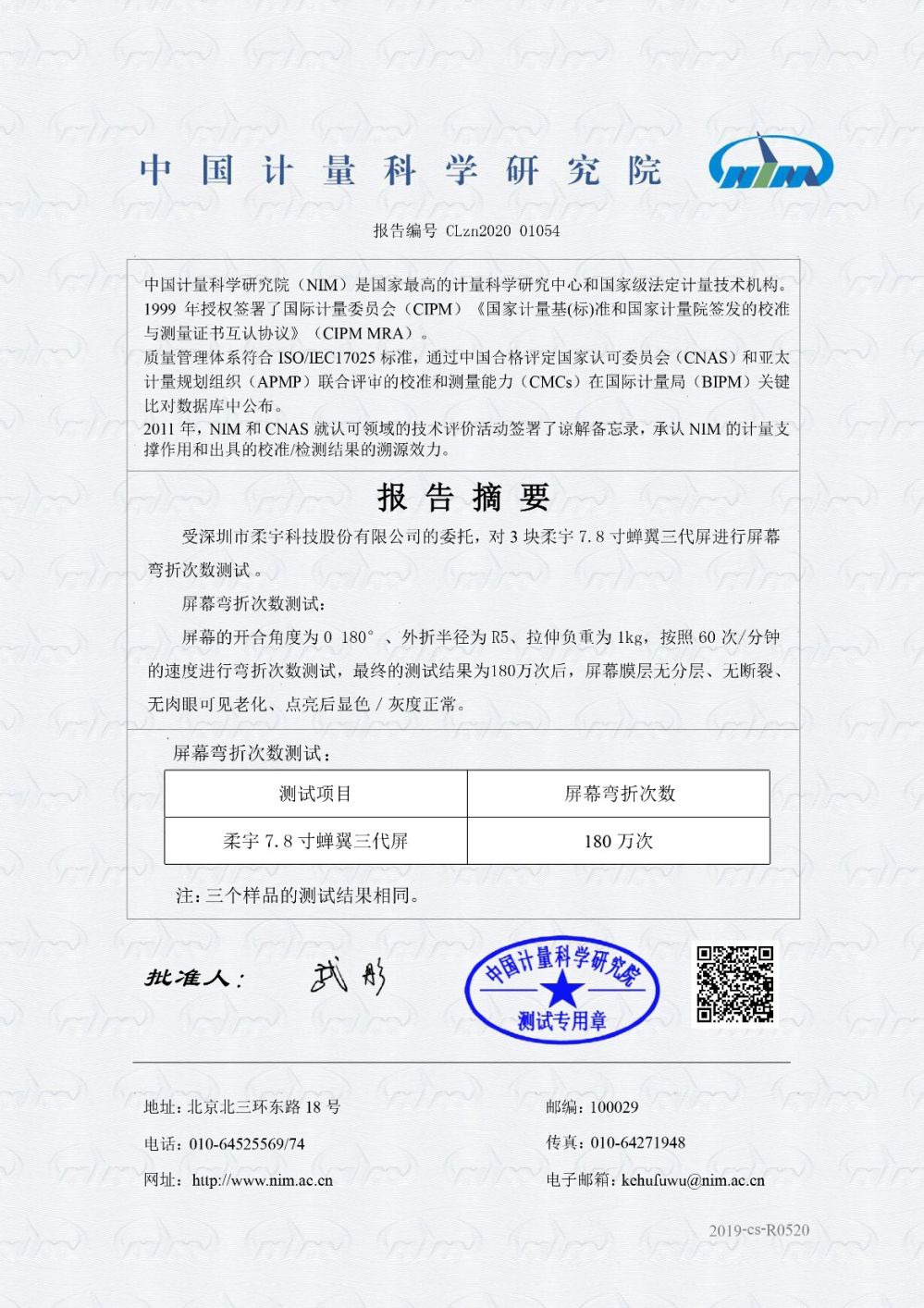 中国计量科学研究院(NIM)是国家最高的计量科学研究中心和国家级法定计量技术机构,根据中国计量院测试报告显示:将柔宇 7.8 寸蝉翼三代全柔性屏固定在水平测试平台上,屏幕的开合角度为0-180度、外折半径为R5、拉伸负重为1kg的测试条件下,按照60次/分钟的速度进行测试,该屏幕在完成180万次的测试完成后屏幕无分层、无断裂、无肉眼可见老化、点亮后显色/灰度正常。