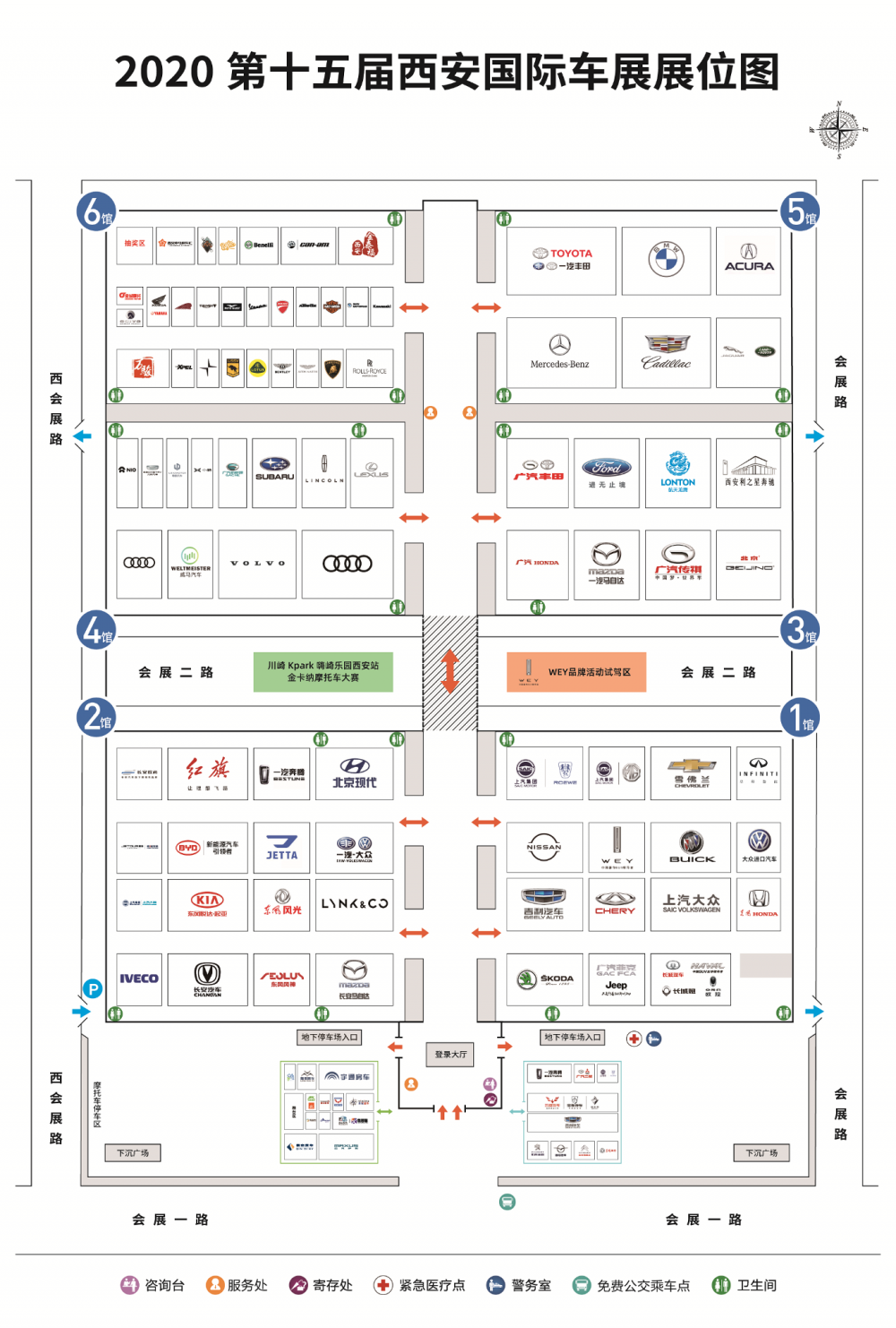 据悉,本届西安车展共使用西安国际会展中心全部6个超大展馆,以及会展中心室外展区、试乘试驾区等。以下为2020第十五届西安国际车展展位图,包括了乘用车展区、摩托车展区、房车展区、kawasaki川崎嗨崎乐园、金卡纳摩托车大赛等。收好展位图,逛展不迷路!