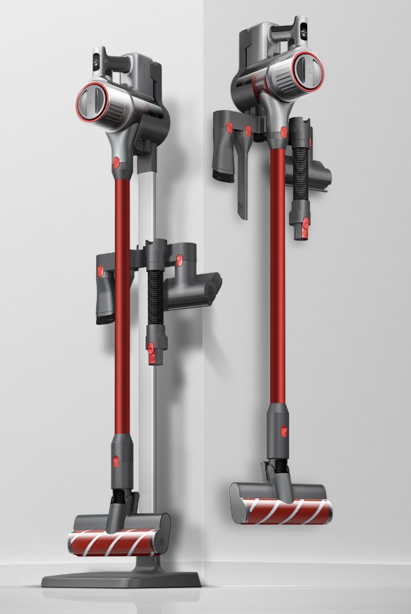 同时,这款吸尘器收纳方便,主机上配有充电接口和充电电极片,用户既可以把铝合金充电收纳支架挂在墙上节省空间,也能使用免打孔式的立地充电支架,把选择权交给用户,很人性化的设计了。