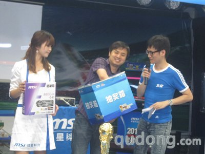 在每一轮精彩激烈的比赛之后,还穿插着丰富的有奖问答、抽奖、观众挑战、奖品展示、节目表演和观众互动等活动,让现场的气氛再度燃烧。微星科技特为本次比赛的现场观众提供了精美而丰富的礼品,通过抽奖发放的三项大奖分别是微星豪华主板、顶级军规显卡各一块和蓝牙鼠标三只。除此之外还组织了四轮的有奖问答环节,简单的问题不仅活跃了现场气氛,更让玩家了解微星的产品和特点,无论答错还是答对,都有精美的礼品赠送,包括了可爱的虎宝宝玩偶、太空水杯、机器人模型、钥匙链、笔记本等几百余件精美的小礼品。