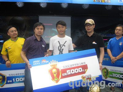 随着朱明舜的夺冠,本届微星杯实况足球世界杯大师赛也接近尾声,比赛的最后微星科技市场部经理何京先生和视阳传媒运营部总监李志先生分别为选手颁奖,冠军、亚军、季军分别获得了5000元、3000元、1000元的奖金,8强选手每人获得微星顶级军规N240GT至尊版显卡一块,16强选手每人获得微星豪华主板880GMA-E45一块,32强选手每人获得微星豪华键鼠套装。