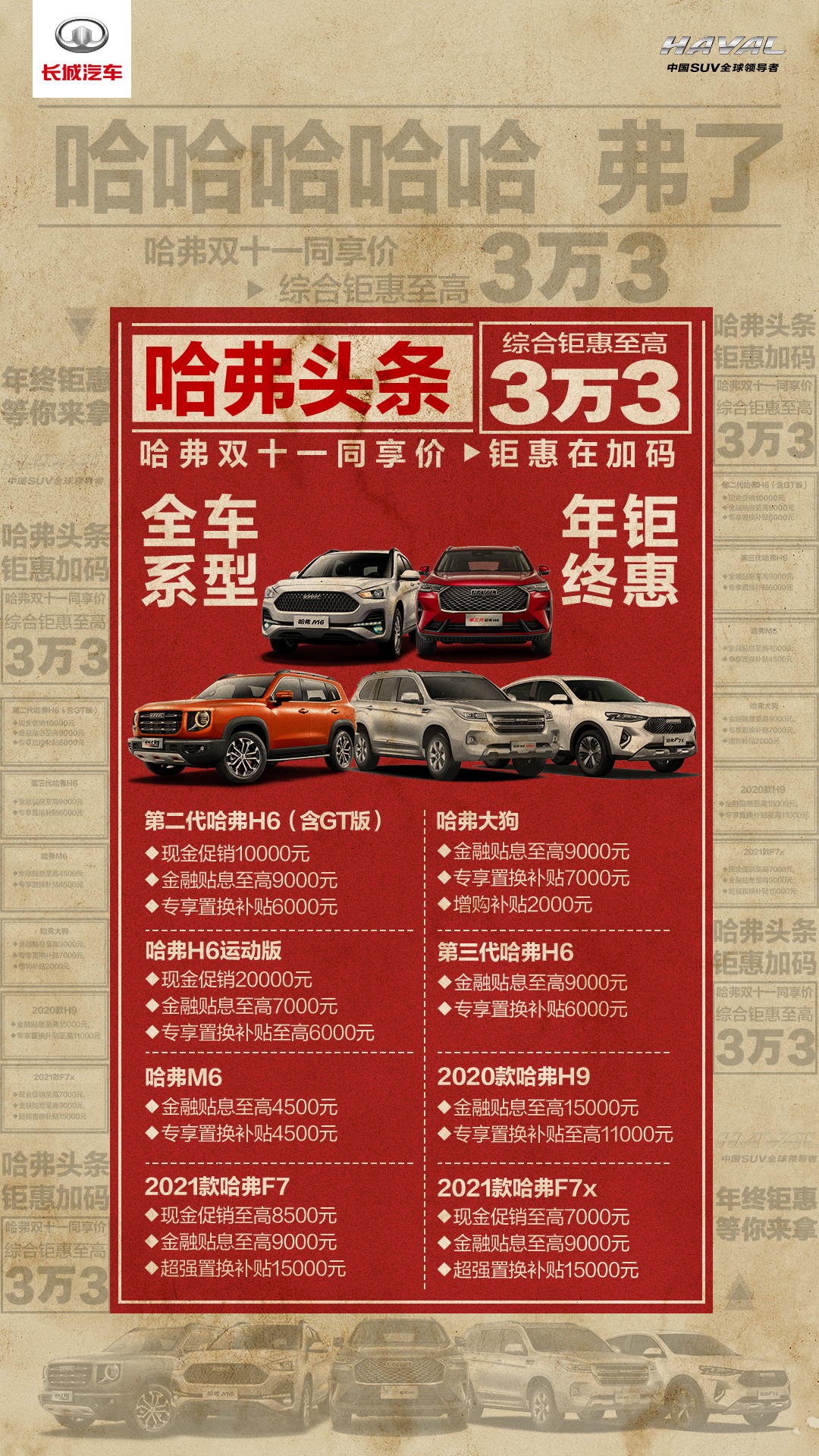 据长城汽车透露,第三代哈弗H6/第二代哈弗H6/哈弗H6运动版、哈弗大狗、哈弗F7/F7X、哈弗M6、哈弗H9等热销车型均参加此次促销活动,最高享受3.3万元的综合优惠,同时在全国1000家专营店推出限时团购会。