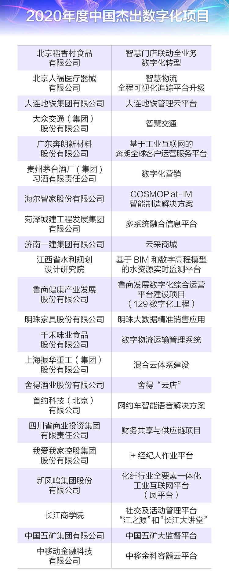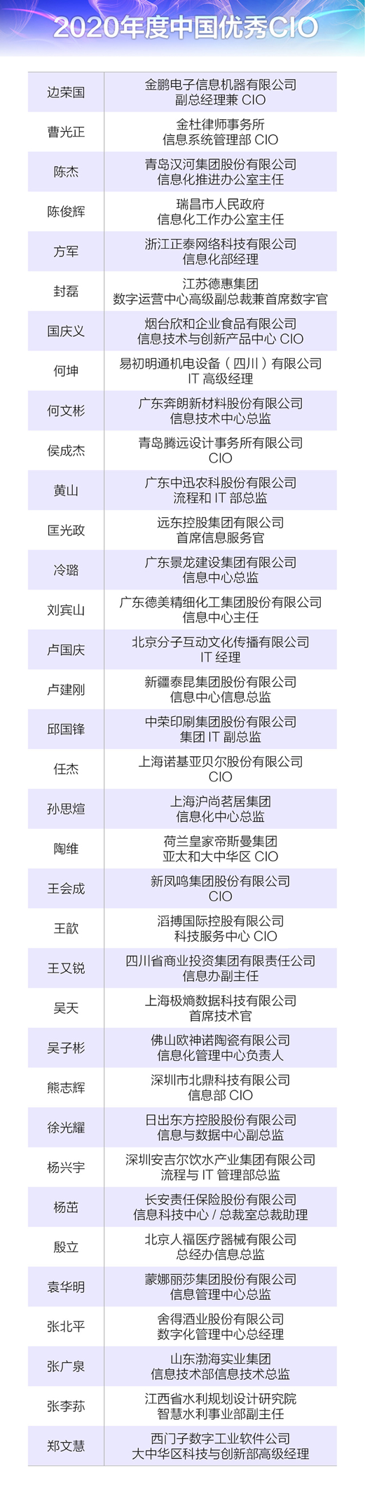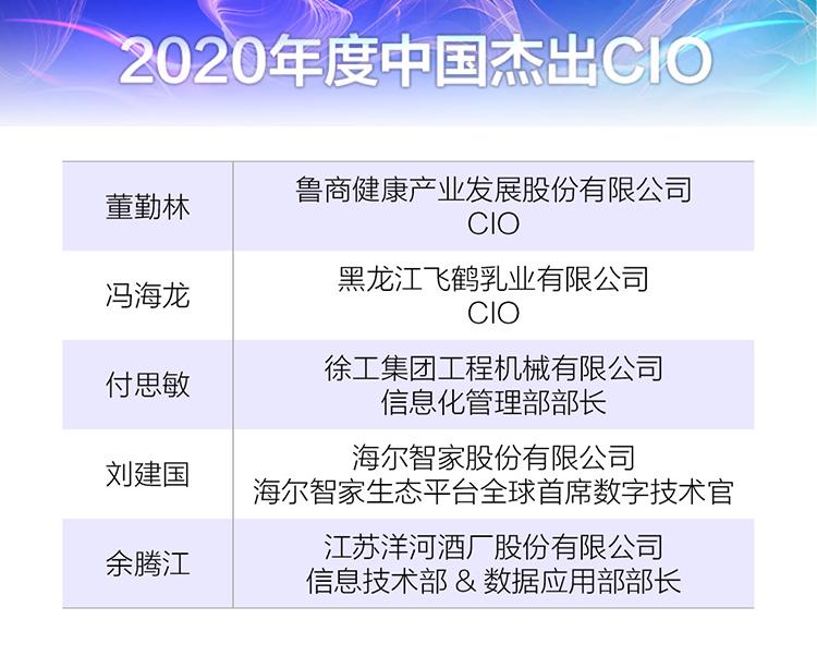 与本届“中国优秀CIO高峰论坛”同期举办的还有“2020年度中国优秀CIO颁奖典礼”。评选活动历时数月,经海选、复选、入围、评审四个阶段,由往届杰出CIO代表、行业专家和权威专家评委对来自各行业的入围名单进行投票评审,综合各方投票及评审结果,最终评选出“2020数字创变系列大奖” “2020年度区域数字化贡献奖”“2020年度中国杰出数字化团队”“2020年度中国杰出数字化项目”“2020年度中国优秀CIO”,以及五位“2020年度中国杰出CIO”。