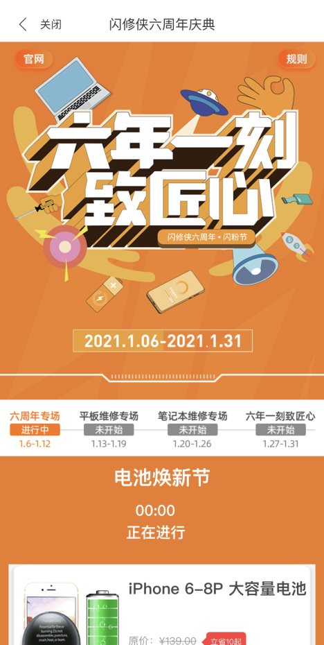“闪粉节”期间,闪修侠全平台预期总让利超500万元,业务覆盖手机、电脑、平板三大类目,囊括电池维修、屏幕换新、内存升级、面容修复、系统调试等不同维度,时间周期从1月6日持续至1月31日,贯穿全月。清晰的节点周期划分,极长的活动周期,让用户可以更清晰、直观感受到品牌诚意和服务的便捷性。