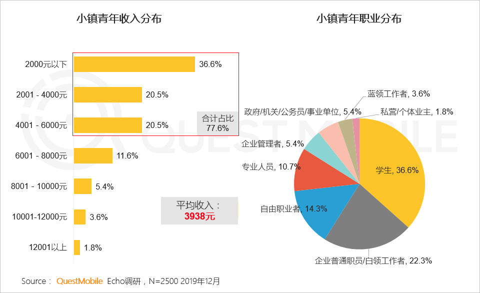 根据QuestMobile对三线及以下城市的90后人群调查显示,小镇青年学生和企业普通职员占比约6成,收入普遍在6000元以下,月平均收入约3938元。其中2000元以下占比为36.6%,2001-4000元占比为20.5%,这两个收入人群的占比加起来,已经过半。