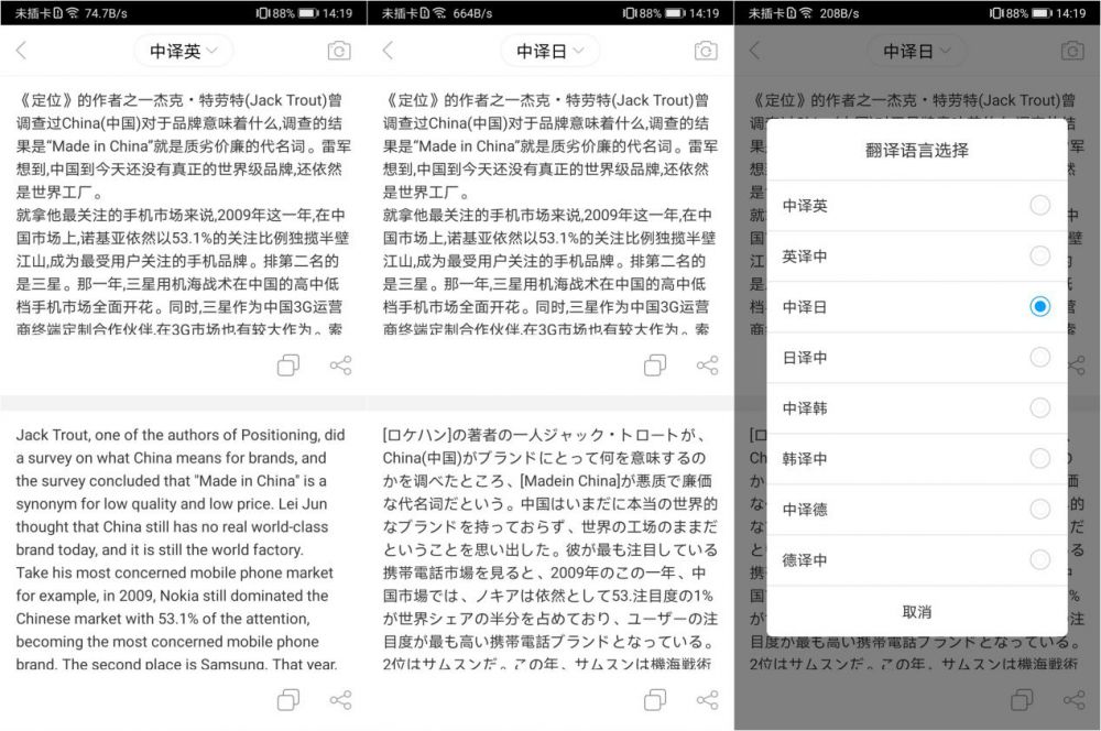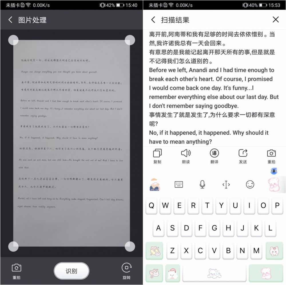 不仅如此,讯飞输入法智能拍照输入还支持英语、日语、韩语、德语四种外语语种输入,拍照输入时选择“翻译”,可直接充当翻译机使用。同时区别于一般提取文字的工具,在输入中英文混合文本时,需要选词甚至切换模式,讯飞输入法智能拍照功能在面对中英文混合文本时,也是一气呵成,无需切换。直接拍照输入一段中英文混合文本,讯飞输入法就能精确识别出来中英文词汇,和原文并无二致。